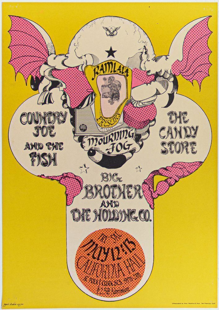 This stunning Ramlala original poster for a Country Joe & Big Brother run of shows at California Hall is one of several killer designs from the venue by artist Michael Wood. The Ramlala Presents posters for Cal Hall are great entry-level posters for new collectors. They are colorful, beautiful, and are often found in really great condition considering their age.