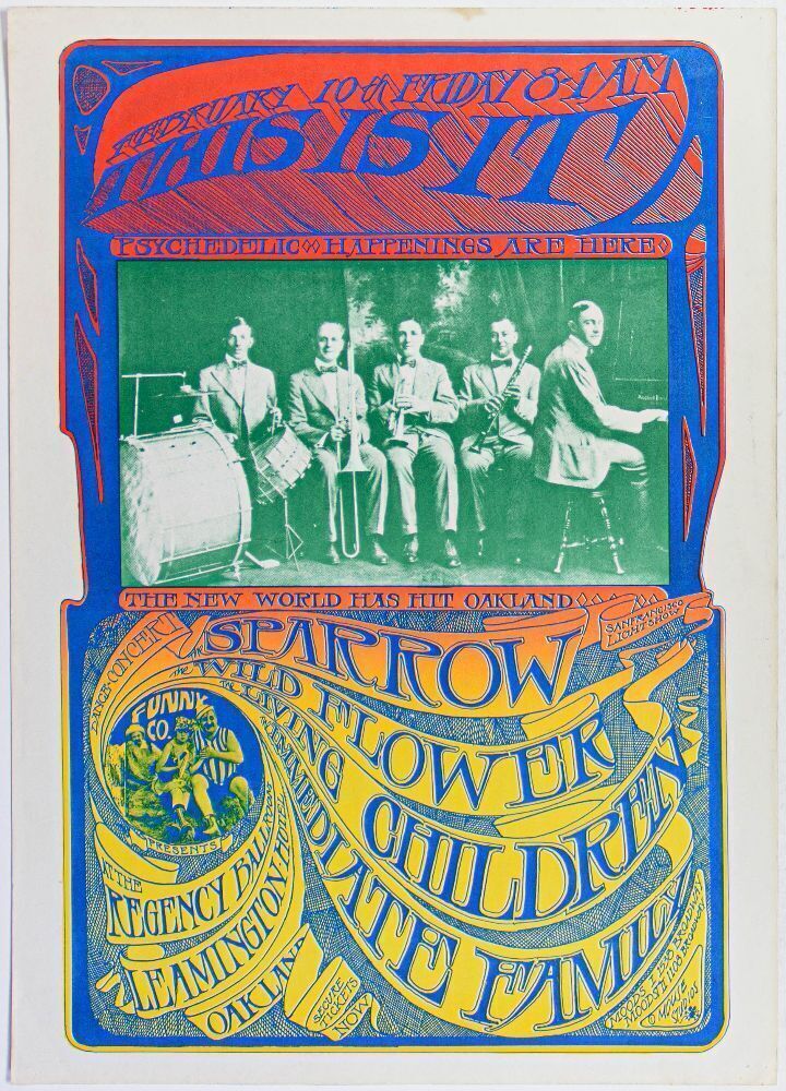 Featured on this original poster from the Leamington Hotel are Sparrow and The Wildflower. Both were early proponents of psychedelic folk rock. The Wildflower were kind of precursors to the hippies and were at the very beginnings of the folk-psych music scene. Sparrow later turned into Steppenwolf! This vintage, colorful 1967 Mouse & Kelley design is a fan favorite.