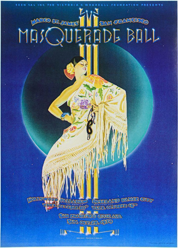 This annual San Francisco event was previously called the Hooker's Ball through 1978. It morphed into the Masquerade Ball the following year and traveled to Hollywood and New York. The events were promoted by self-described prostitute and sex-positive feminist Margo St. James. This poster for Los Angeles, New York, San Francisco 1979 was beautifully designed by noted artist Randy Tuten.