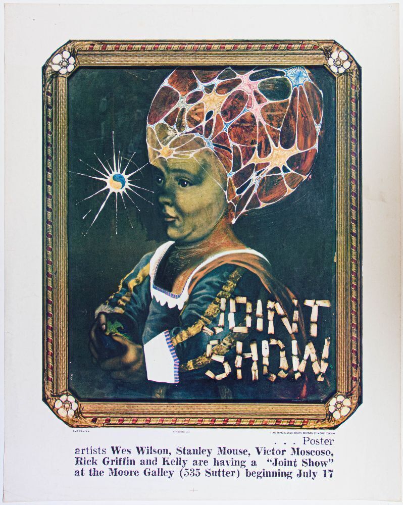 This is the rare First Edition printing of this issue ("First Edition 1200" credit at the bottom center under the image), and this particular example is one of the slightly larger UNCUT versions. This image is artist Stanley Mouse's contribution to the 1967 Joint Show. The show featured the work of top poster artists of the day. The exhibition was held at the Moore gallery in San Francisco on July 17th, 1967.