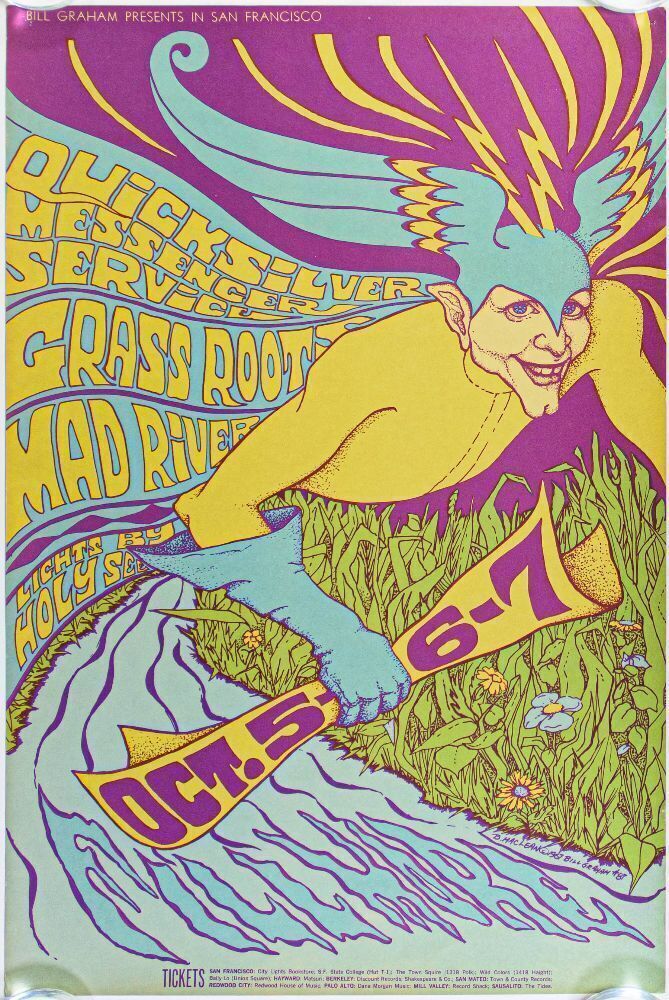 Artist Bonnie MacLean's passing a few years back made headlines around the world due to her fabulous body of work and contribution to the hobby. This international recognition underscores the desirability of this lot. The BG-87 original poster from 1967 depicts the Roman God Mercury. It is a brilliant play on words used to advertise a Quicksilver run of shows at the Fillmore Auditorium.