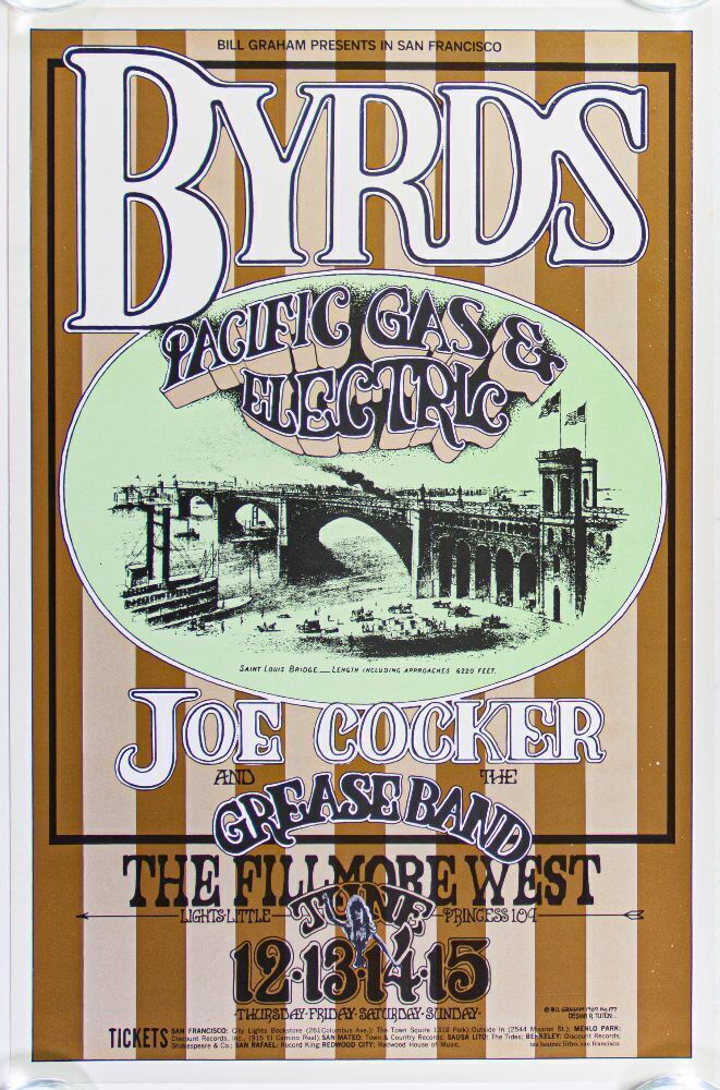 The Byrds, Pacific Gas & Electric, and Joe Cocker are featured on this Fillmore West poster created by Randy Tuten. An original first-printing Bill Graham poster!