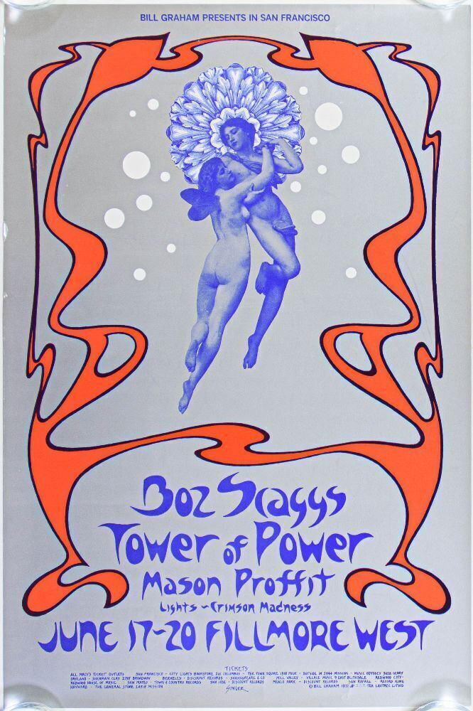 Performers Boz Scaggs, Mason Proffit, and Tower Of Power are featured on the BG-285 original concert poster for the Fillmore West in June 1971. This poster was designed by artist David Singer.