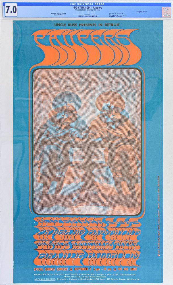 This is an original pre-concert first printing poster by Gary Grimshaw for the Paupers. The Paupers were a short-lived Canadian psychedelic rock band. This popular poster is one of the most sought-after in the Grande Series. The vibrating photographic image and Grimshaw psychedelic lettering make this piece a sure winner. All posters from the Grande Ballroom are highly sought after and very collectible. Why? Because these posters were printed in extremely small runs of just 500 the Grande Ballroom was the epicenter of the ’60s scene in the upper Midwest, and the artistic quality of the artworks rivals anything done out west.