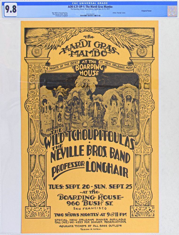 The Wild Tchoupitoulas, The Neville Brothers, and the great Professor Longhair are featured on this Mardi Gras Mambo original poster from The Boarding House in San Francisco in 1977. The Cajun piano mastery of Professor Longhair is a joy to behold, and this lineup for a Tuesday through Sunday run of shows at the Boarding House looks incredible! The poster's design was created by artist Randy Tuten.