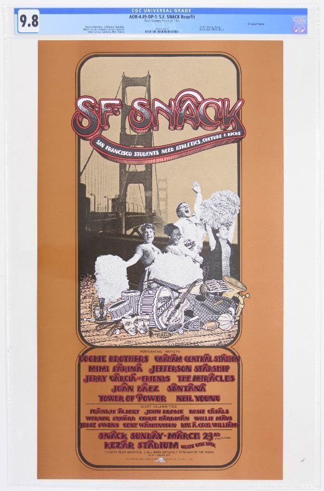 This benefit show was held at Kezar Stadium in San Francisco. S.N.A.C.K. - Students Need Athletics, Culture, And Kicks- was a project of Bill Graham to give back to the community. Graham staged the concert with 11 performers and over 50 guest celebrities in March 1975. Bob Dylan performed on Sunday, although he is not listed on the poster. Noted artist Randy Tuten designed this beautiful original poster.