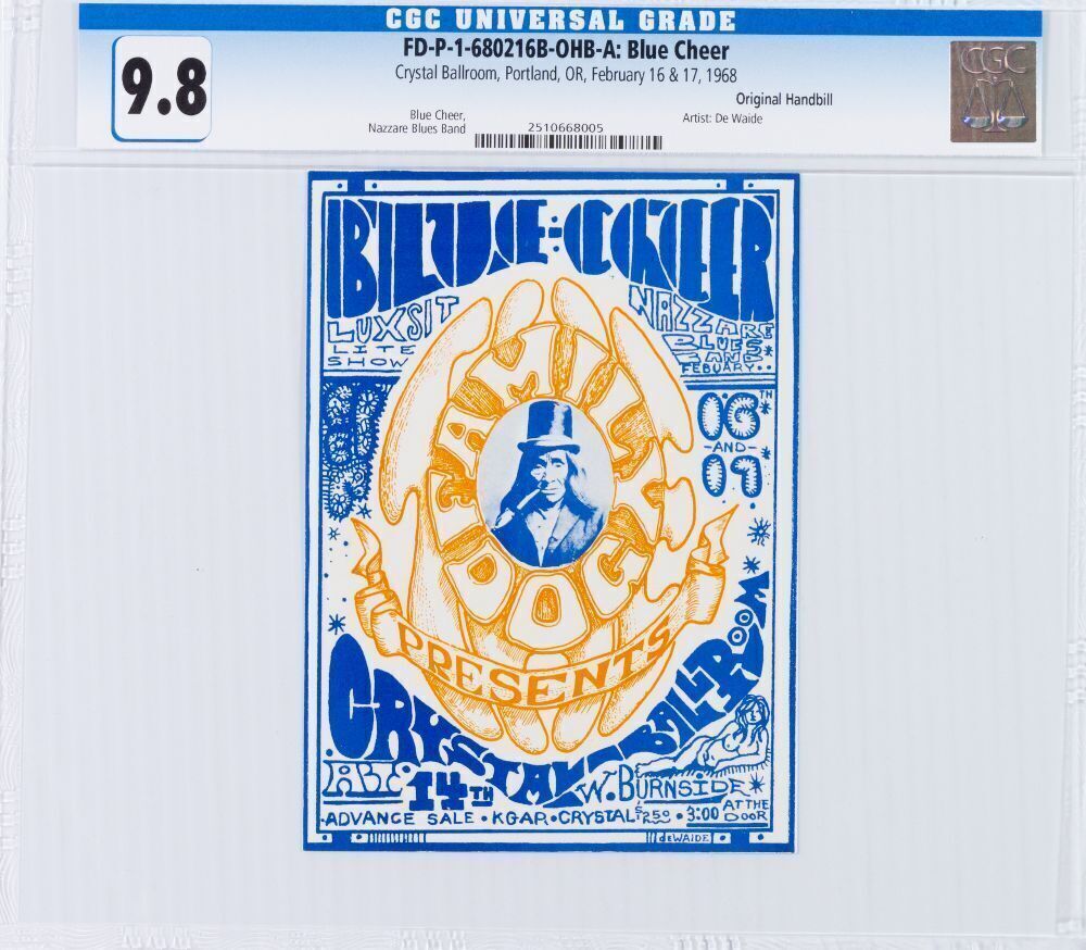 Only handbills for this initial Portland "Crystal Dog" (as it came to be known and which first appeared in the lettering of the handbills & posters produced for the venue after the March 8 & 9th, 1968 concert) are known to be produced thus far - no posters were made. Museum quality copies of this handbill are far scarcer than lesser condition copies. This handbill was printed on slick white cannery label stock. The artwork surrounding the Family Dog logo was created by DeWaide. Blue Cheer's epic LP Vincebus Eruptum had just been released prior to this Portland gig.