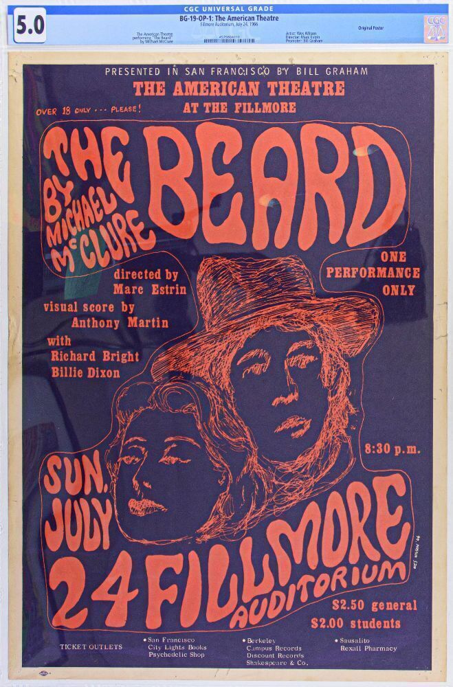 This poster was designed by the late great Wes Wilson for a performance of the Beard at the Fillmore. The Beard was a play by beat playwright Michael McClure, and it’s a true gem from the era. Although not a musical event, The Beard was a perfect illustration of how inspired young artists pushed the envelope and created a new culture.