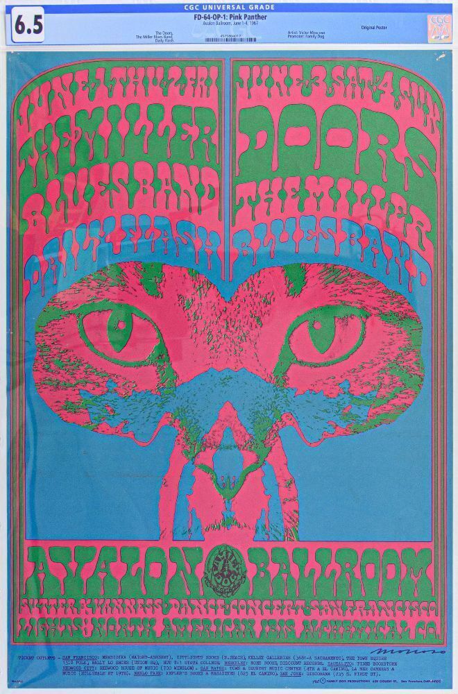 Collectors love to seek out original first-print posters featuring The Doors, and we at PAE are always jumping for joy when we can offer one from the historic Avalon Ballroom! If you are looking for a poster that has it all, this lot is for you. Great bands, amazing art by Victor Moscoso.