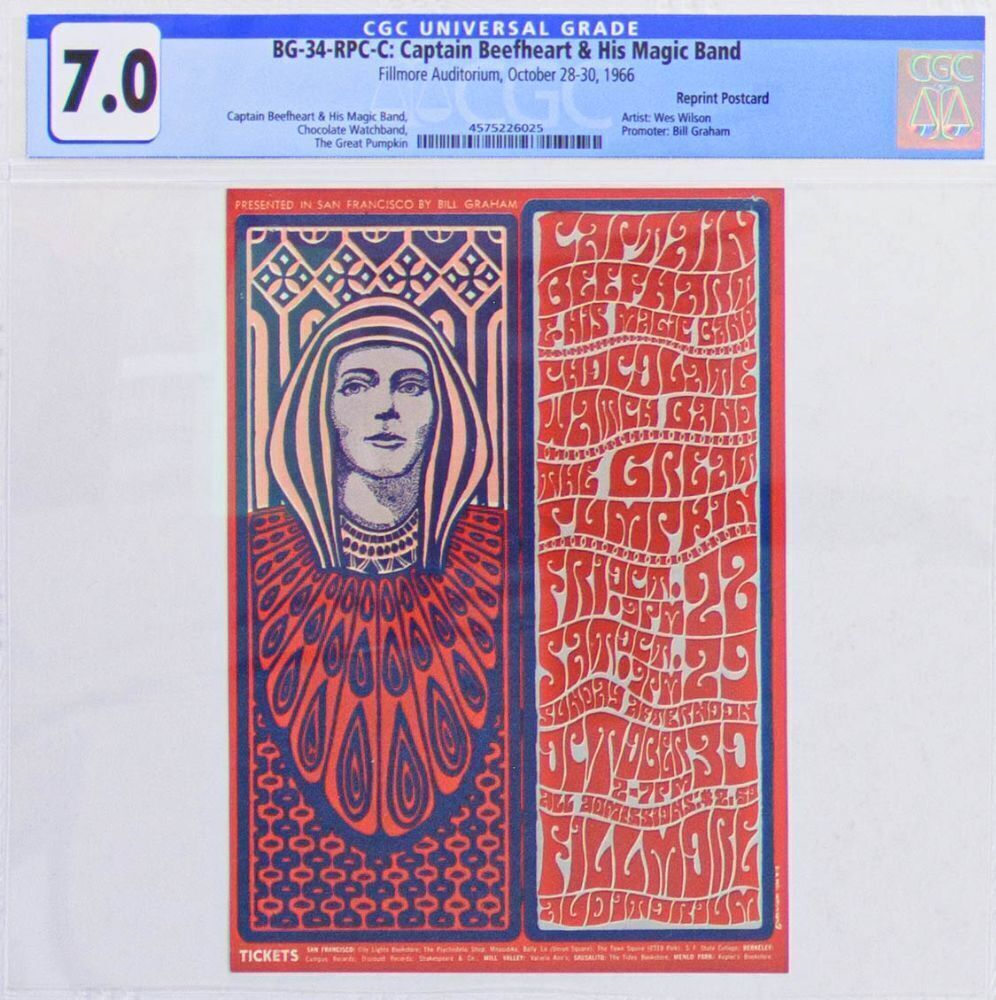 This second-printing postcard features Wes Wilson's stunning advertisement for a performance by the enigmatic Captain Beefheart and His Magic Band at the Fillmore, and this is an early Fillmore favorite.
