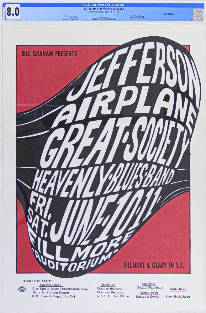 This second-printing poster offers the same popular and iconic art for far less than a First Print currently commands. The BG-10 is a classic early Wes Wilson design and the bulging lettering is yet another innovation by this legendary artist of early Fillmore issues.