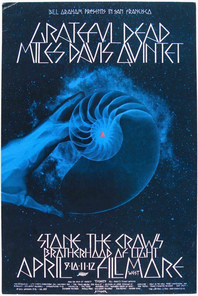 What a poster! Original First Printing preserved in great condition! This had to be one of the greatest pairings Bill Graham ever put together: Miles Davis and the Grateful Dead! Miles once stated that he didn't care much for the rock scene but that Jerry Garcia was one guy who really made music (or something to that effect). This design by David Singer is one of the artist's most popular images.