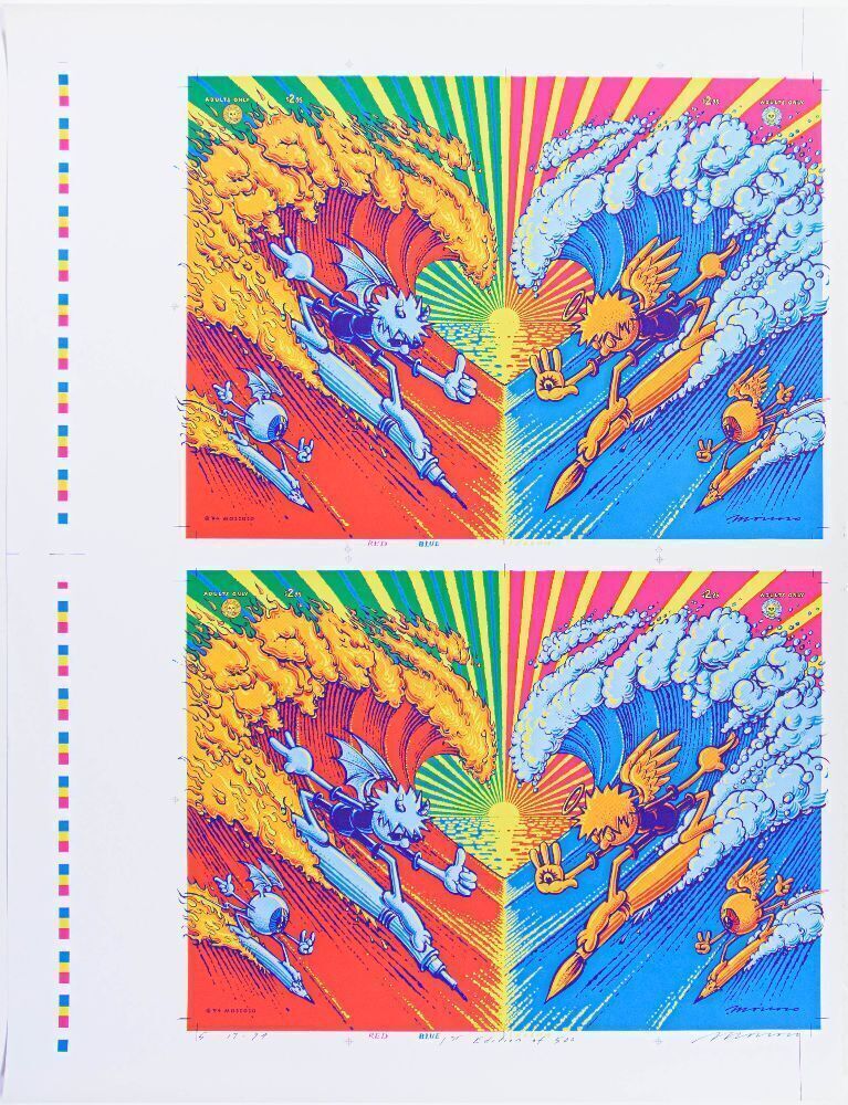 This is an uncut-proof poster featuring the cover art for issue #13 designed by the legendary Victor Moscoso in 1994. This was the first issue of Zap Comix that was published after the death of Rick Griffin, an esteemed poster artist and Zap Comix contributor who had originally been slated to produce the cover art for this issue. Moscoso's art pays homage to Griffin by emulating his style. Griffin was well known for his surf art as well as his use of the flying eyeball, both of which are referenced in this image.