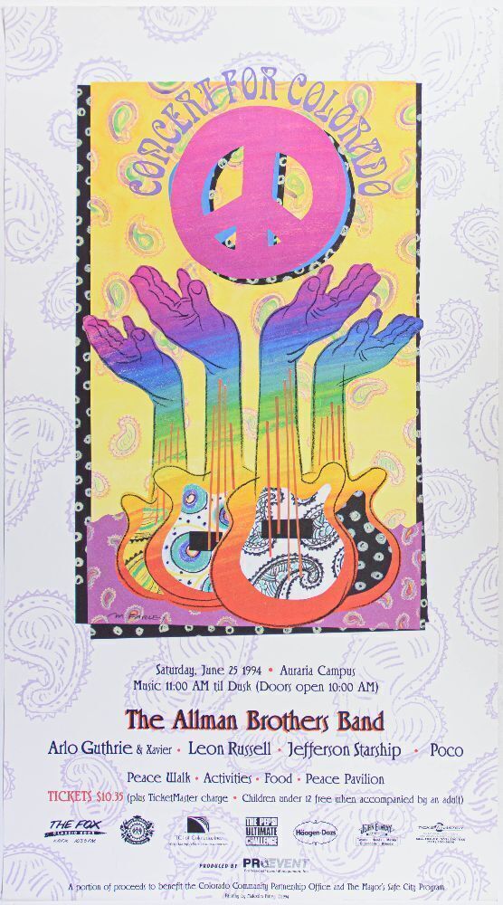 This poster was produced for a "Concert for Colorado" featuring the Allman Brothers Band, Arlo Guthrie, Leon Russell, Jefferson Starship, and Poco. It was held on the Auraria Campus in Denver, Colorado on June 25th, 1994.