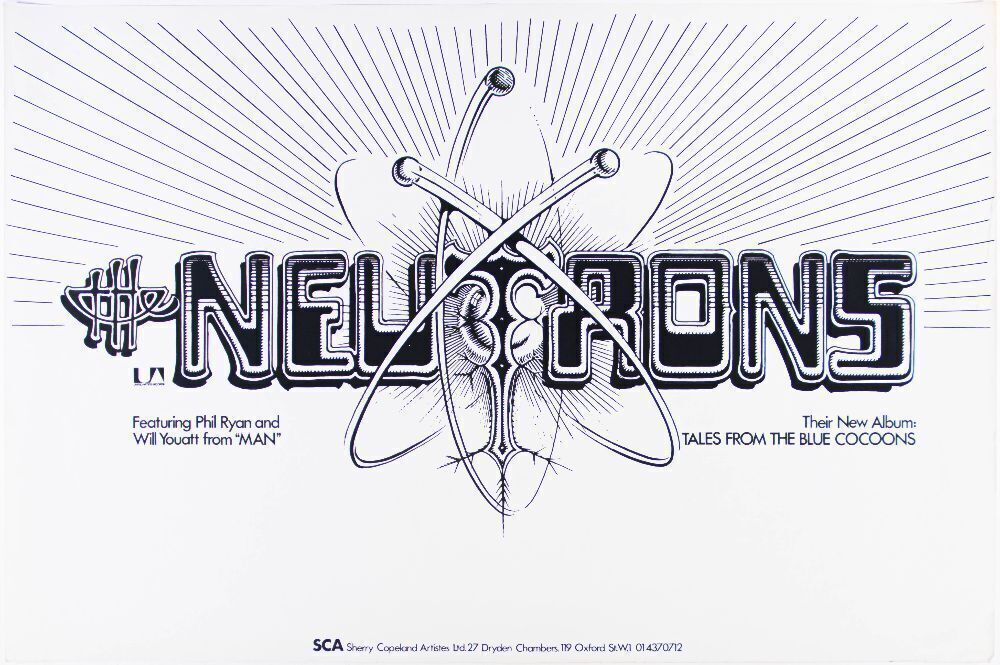 This promo poster was created for The Neutrons' debut 1975 album "Tales from the Blue Cocoons." The band featured Phil Tuan and Will Youatt from the band Man. The art features the band's logo, which was created by the late, great Rick Griffin. Griffin had previously worked with Man to create album artwork artwork as well.