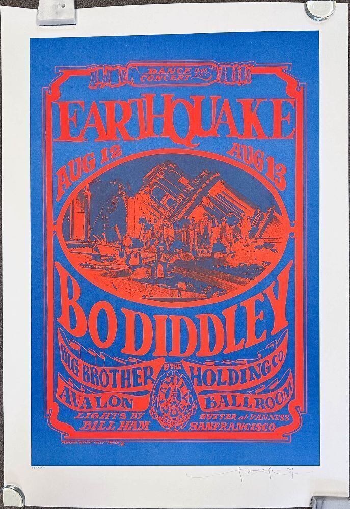This limited-edition 2008 reprint of the FD-21 poster is one of just 350 copies. This Stanley Mouse and Alton Kelley classic FD-21 Avalon poster depicts the devastation from the “Great Earthquake”, one of the most important events in California history.