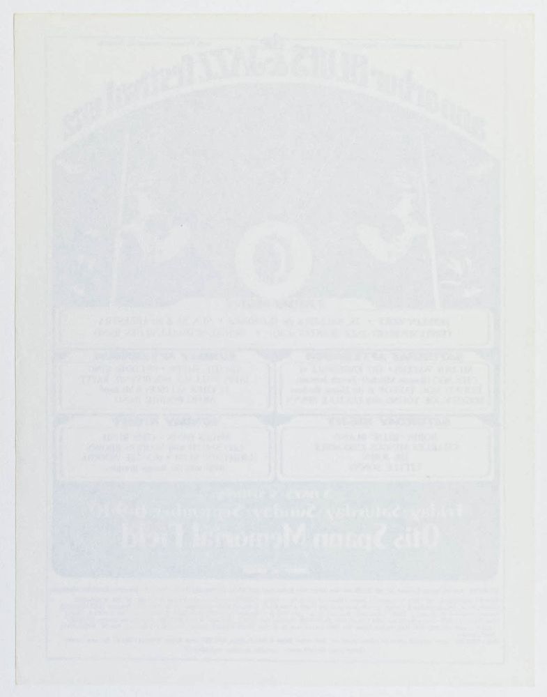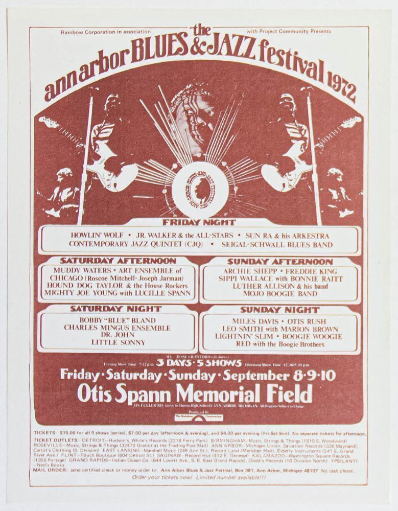 This handbill was created for the 1972 Ann Arbor Blues & Jazz Festival. The festival was held on Friday, Saturday & Sunday, September 8, 9 & 10, 1972 at Otis Spann Memorial Field. High-profile artists appeared, including Howlin' Wolf, Sun Ra & his Arkestra, Otis Rush, Miles Davis, and many more! The reverse of the program features artwork by the great Detroit poster artist Gary Grimshaw.