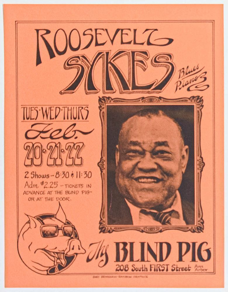 This handbill was designed by artist Gary Grimshaw for blues piano player Roosevelt Sykes, playing for three nights at The Blind Pig in Ann Arbor, Michigan, in February 1973. Gary Grimshaw was an influential American graphic artist and poster designer who made a significant impact on the counterculture and rock music scene during the 1960s and beyond.