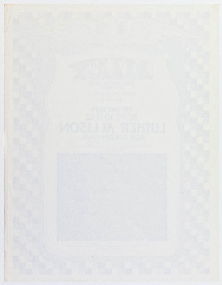 This Gary Grimshaw-designed handbill announced Luther Allison's three-night run at The Alley in Ann Arbor, Michigan, in September 1976, with support from Bob Goldenthal and His Blues Band. Allison was a key figure in the Chicago blues scene.