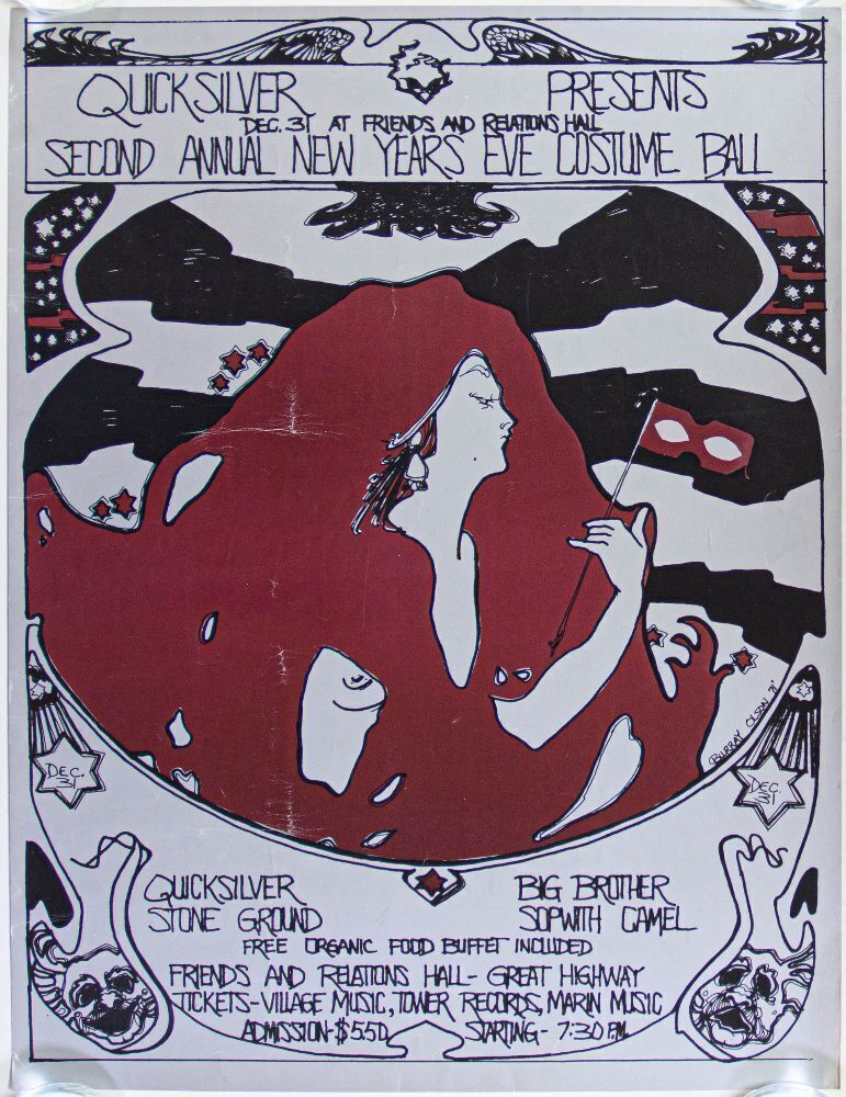This psychedelic poster advertised Quicksilver Messenger Service's Second Annual New Year's Eve Costume Ball. The event took place at Friends and Relations Hall in San Francisco on New Year's Eve in 1971. Other performers included Big Brother, Sopwith Camel, and Stone Ground. 100% original with no restoration!