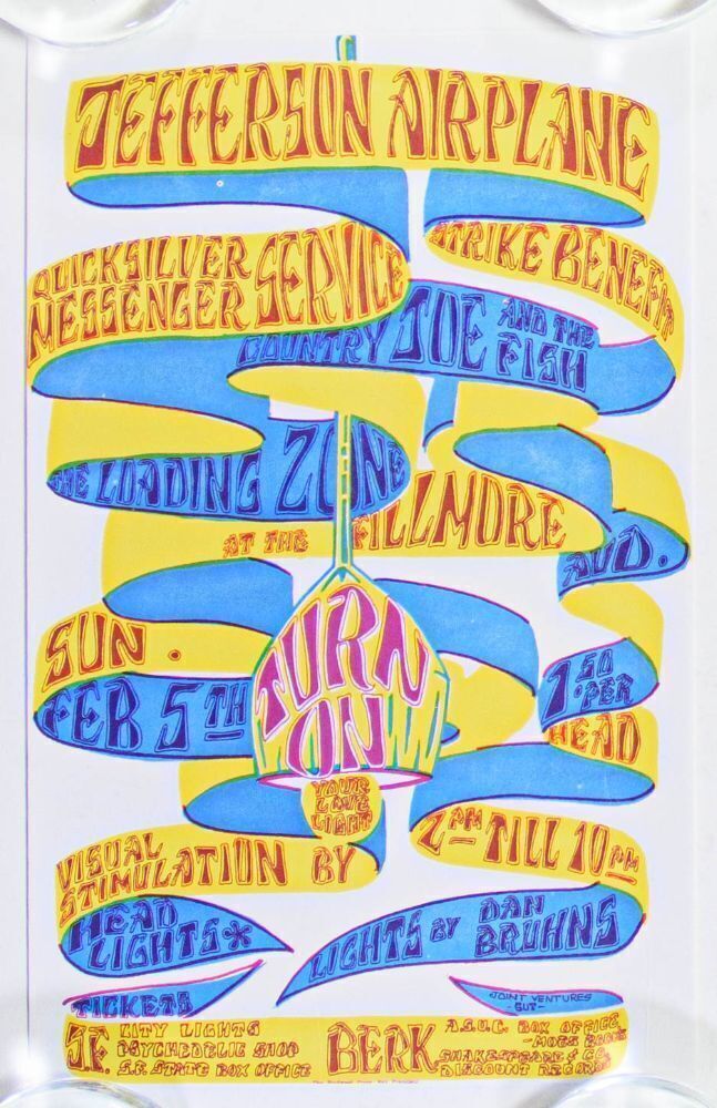 This 1966 handbill was created for one of the benefit events held at the Fillmore Auditorium called Turn On. Featured was the great line-up of Jefferson Airplane, Quicksilver Messenger Service, Country Joe & the Fish, and the Loading Zone.