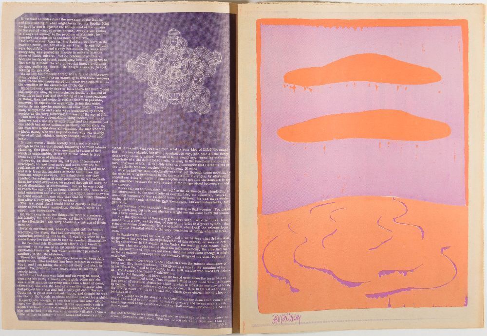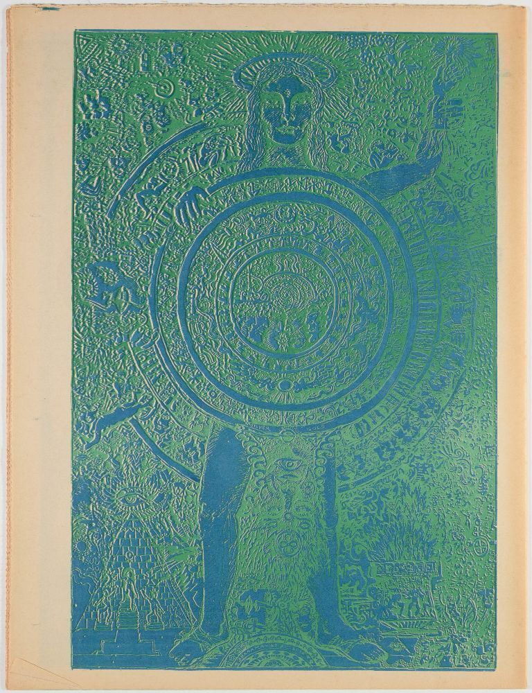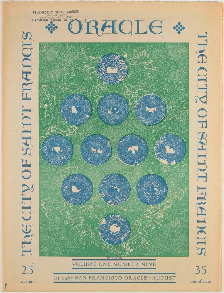 The San Francisco Oracle was an underground newspaper that published 12 issues between September 1966 and February 1968. It was distributed in the Haight Ashbury area and was an early member of the UPS (Underground Press Syndicate). It combined poetry, spirituality, and multicultural interests with psychedelic design reflecting on the countercultural community. Many issues had ads for music and records. The Oracle is the most famous and collectible of any underground paper. Contributors included many significant San Francisco-area artists, including the late, great Rick Griffin. It also featured such beat writers as Allen Ginsberg, Lawrence Ferlinghetti, and Michael McClure. This lot contains San Francisco Oracle Issue #9, released August 1967. It was printed in multiple colors, with this one being the green and blue version.
