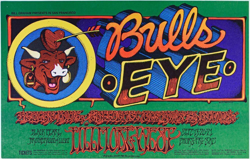 It's not hard to understand why this is one of Rick Griffin's most popular and sought-after posters. Just beautifully rendered! If you want a poster with great art, a great band, and great condition, and at a great price level, this piece is for you! Eric King states in his guide that many psychedelic posters have their origins in advertising images. This one is derived from a French cheese company logo known as La Vache Qui Rit, which is usually translated as The Laughing Cow.