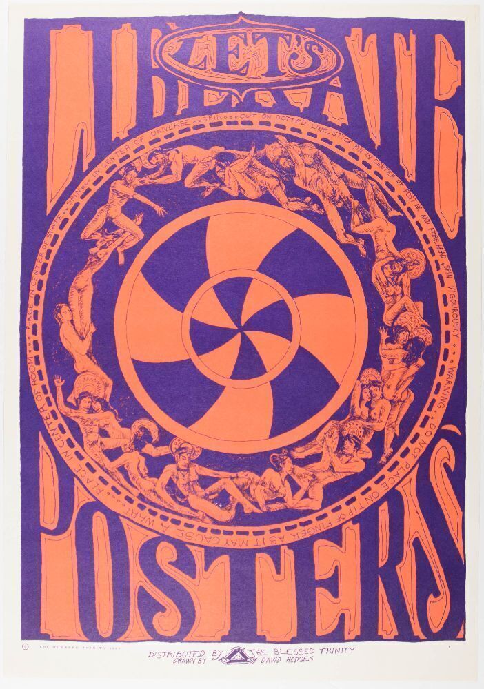 This headshop poster by David Hodges was produced in 1967 and was distributed by The Blessed Trinity. It reads "Let's Liberate Posters". Hodges designed several posters in the late 60's including a Diggers-sponsored event billed as The Invisible Circus at Glide Church, and many others.