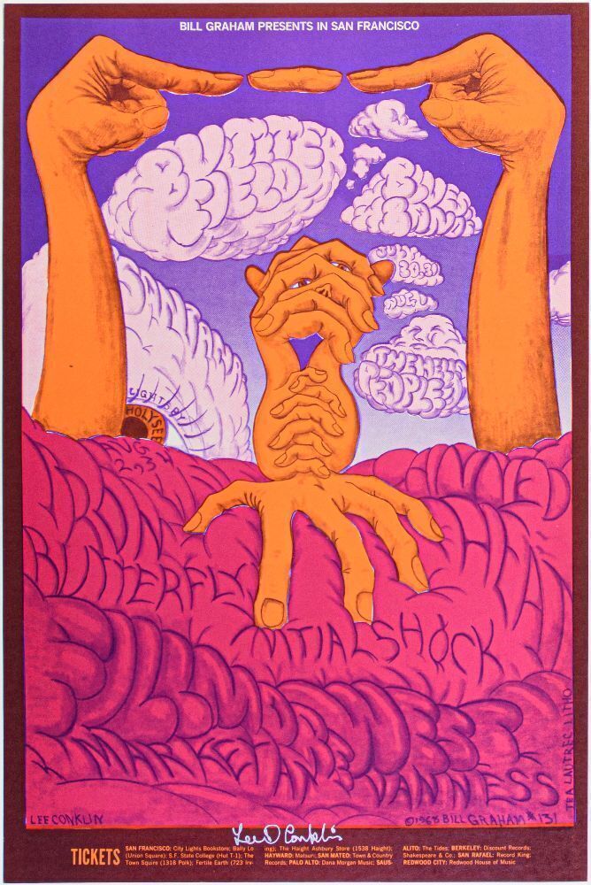 Another amazing pre-concert original printing concert poster by the amazing Lee Conklin! The Butterfield Blues Band, Santana, Hello People and the mighty Iron Butterfly were featured on this run of shows at the Fillmore West in the summer of 1968. Psychedelic poster to the max and featuring great bands of the era!