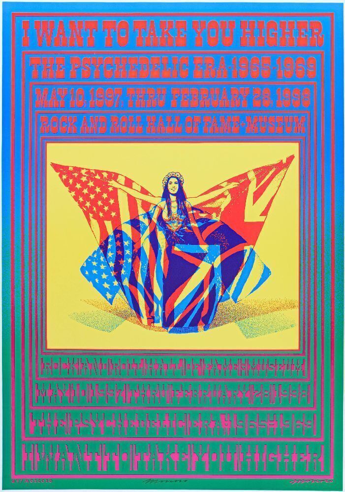 This Moscoso piece from 1997 reads "I want to take you higher, The Psychedelic Era 1965-1969". It was created for an exhibit at the Rock and Roll Hall of Fame museum, which showed from May 10, 1997, until February 28, 1998. A beautiful poster featuring Moscoso's classic style!