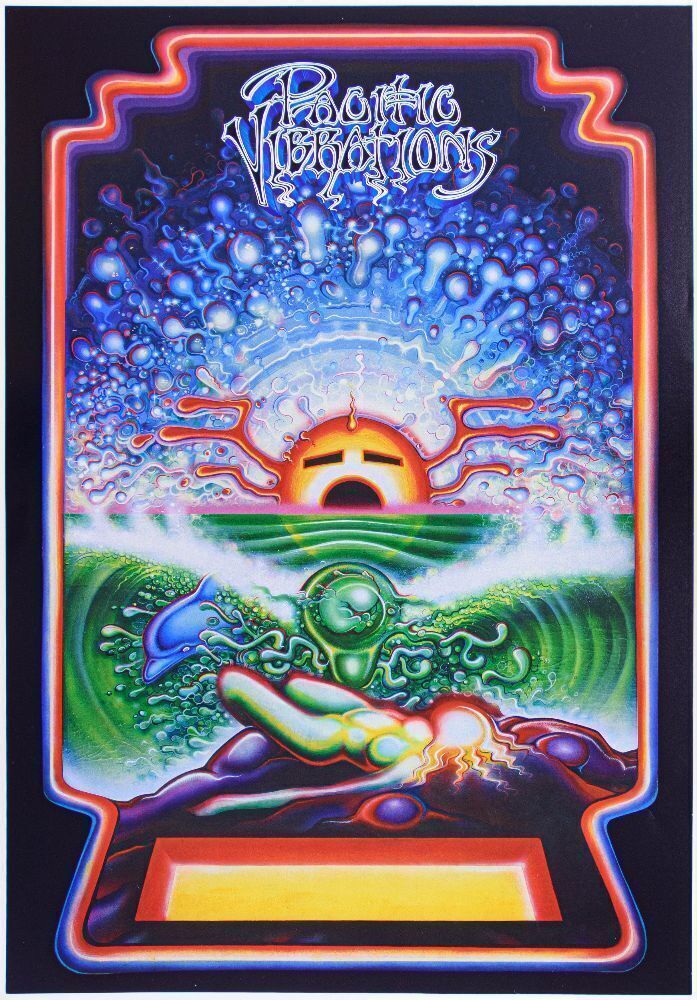 John Severson's 1970 film Pacific Vibrations is highly regarded as one of the top surfer movies of the era. This image you see here was designed by the master, Rick Griffin and used to advertise the film's release. This authorized 2nd printing poster was printed by the owner of the original painting, Jay Gould, who went to great lengths to create a high quality version of the artwork. This printing exhibits sharper definition, focus & colors, far more HD than the original movie printing poster from 1970, and without ANY of the movie text to detract from the high voltage imagery. Gould only printed one print run of 1,000 copies in 1989, which sold out in 1995 or 1996. Filmmaker John Severson, also internationally famous for his work with Surfer Magazine, sadly passed away several years ago.