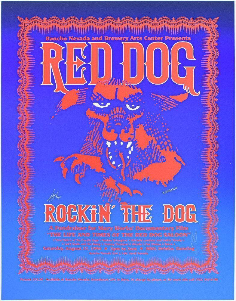 This poster from August 1994 was produced for a fundraiser event at Brewery Arts Center in Carson City, Nevada. The event raised money for "Rockin' The Dog", a documentary film by Mary Works about the Red Dog Saloon. The documentary followed how the Virginia City, Nevada, saloon was an incubator for psychedelic rock music and culture in the 1960s. The Charlatans' historic 1965 run of shows at the venue are considered the “first ever” psychedelic dance concerts.