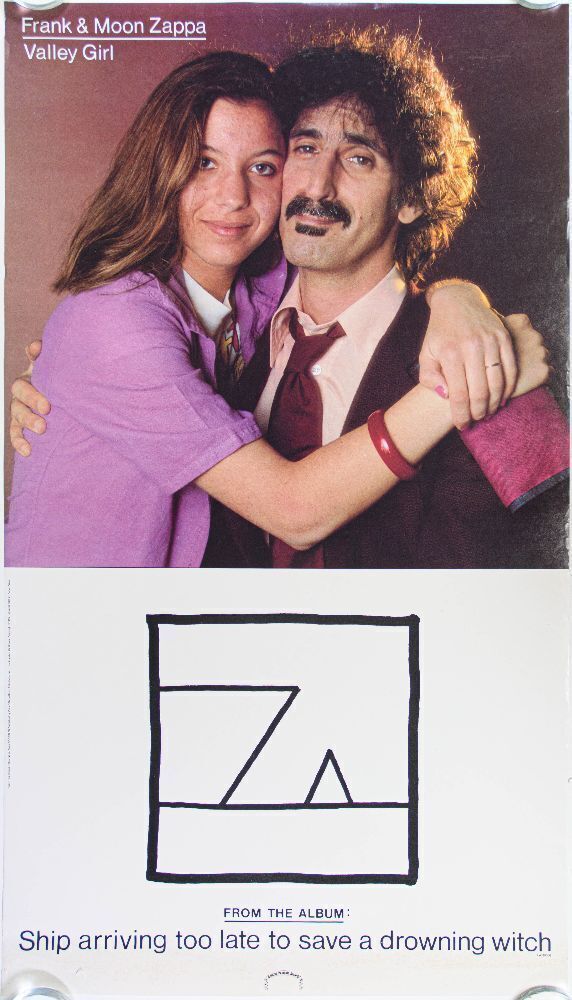 This promotional poster was produced for Frank Zappa's 1982 album Ship Arriving Too Late to Save a Drowning Witch, which included the single "Valley Girl," which featured Zappa's daughter, Moon. The single peaked at #32 on the Billboard charts, the only Zappa tune to ever break the top 40. It was subsequently nominated for several Grammys.