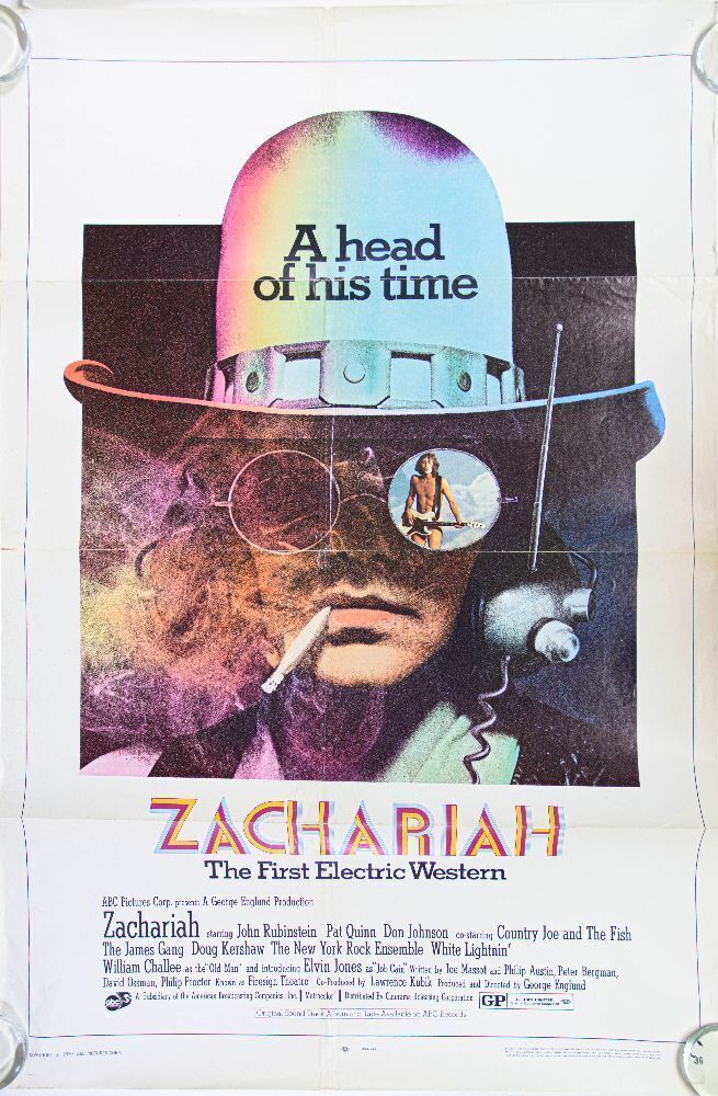 This promotional poster was produced to promote the 1971 film "Zachariah," billed as "the first electric Western." The film featured a soundtrack that included James Gang, Joe Walsh, and Country Joe and the Fish, and Country Joe and the Fish even starred in it.