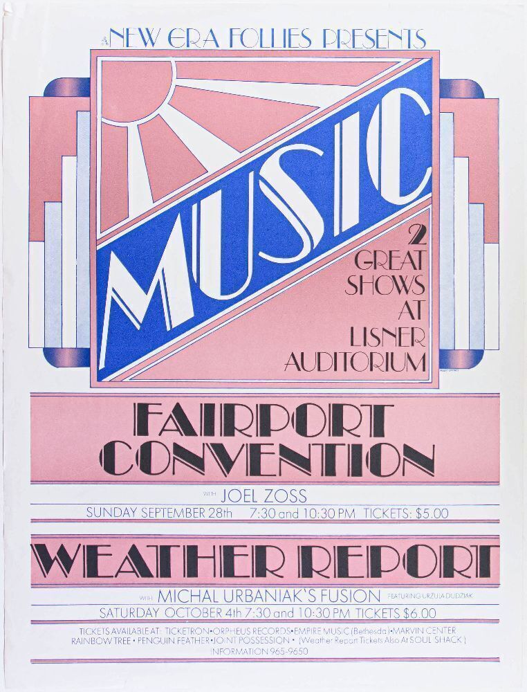 This rare poster announced two events at the Lisner Auditorium in Washington, DC, in the Fall of 1975. The first show featured British folk-rock outfit Fairport Convention, who had released their tenth studio album Rising for the Moon a few months prior. This was the final album to feature vocalist Sandy Denny, as well as their last to chart in the UK, as the band experienced numerous lineup changes in the latter part of the decade. The second show was headlined by the legendary Weather Report, who had recently released their fifth studio album, Tale Spinnin'. The jazz-fusion band is heralded as one of the pioneers of the genre.