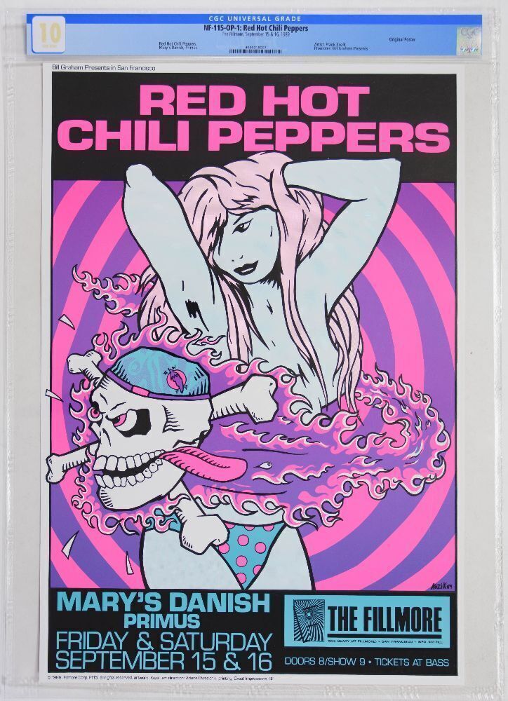 A HIGH GRADE PERFECT 10! Here we have a beautiful 1989 original poster designed by Frank Kozik for the Red Hot Chili Peppers at the Fillmore. Additional acts Primus and Mary's Danish were supporting these shows in San Francisco. The colorful image exhibits all of the wonderful traits Kozik was implementing into his designs in those days.
