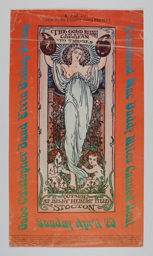 This rare original poster advertised Fleetwood Mac, Buddy Miles, Canned Heat, Elvin Bishop, and the Gabe Christopher Band appearing at Billy Hebert Field in Stockton, California, on April 29th, 1973. Reports indicate the concert descended into a violent riot involving tear gas, pepper fog, and rubber bullets used by police against a crowd of around 20,000 - stemming from an initial fight between motorcycle gangs and escalating to mass arrests & injuries. It's a wonder this poster survived the madness of the day! This is the FIRST example of this poster to ever appear in our auction!