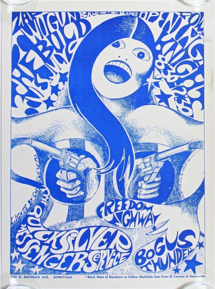 This great-looking poster was produced for Quicksilver Messenger Service, Freedom Highway, and Bogus Thunder appearing at 769 N. Mathilda Ave in Sunnyvale, California on July 9th, 1967. Although they were not as commercially successful as some of their contemporaries, like Jefferson Airplane and the Grateful Dead, Quicksilver Messenger Service was integral to the start of the San Francisco sound. With their jazz and classical influences, as well as a strong folk background, the band created an individual, innovative sound. We've never seen another example of this poster in our auction, and this one is in MINT condition!