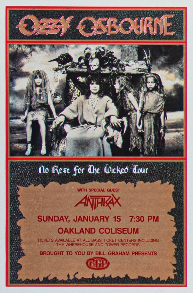 This original concert handbill was created for a stop on the late great Ozzy Osbourne's 1989 No Rest for the Wicked Tour in support of his studio album release of the same name. The show occurred at the Oakland Coliseum on January 15th, 1989. The tour was in support of his fifth studio album by the same name, released the year prior. Thrash metal legends Anthrax opened the show.