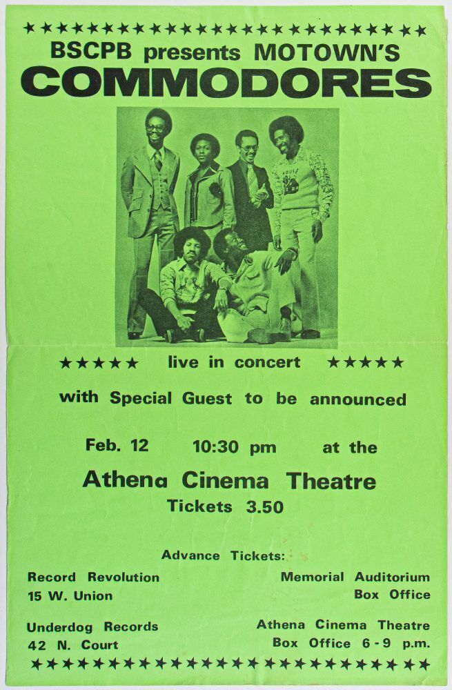 The Commodores were a funk/soul Motown group that rose to fame in the late 1970s. They were perhaps best known for being Lionel Richie's band before he went solo. This poster announced their appearance at the Athena Cinema Theatre in Athens. Ohio on February 12th, 1973. Though the band initially formed in 1968, they wouldn't release their debut studio album, Machine Gun, until the following year.