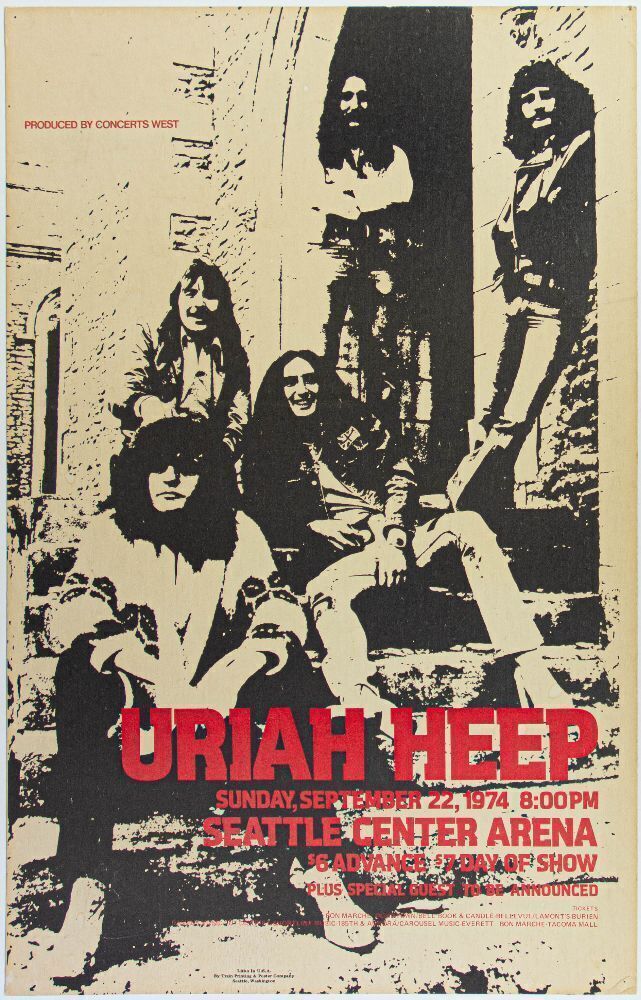A vintage cardboard poster promoting the prog-rock/heavy metal masters Uriah Heep. The band played at the Seattle Center Arena on September 22nd, 1974. This was during their peak era, which showcased strong vocal harmonies and original singer David Byron's quasi-operatic vocals! Material from the Pacific Northwest is always considered special by collectors. They often tell a story all their own and have a different vibe than pieces from other parts of the country. Posters like this are highly collectible and are notably representative of the music-loving culture that produced them.