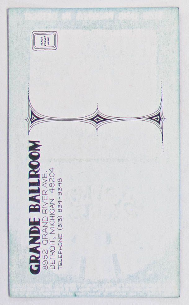 This card advertises Spirit, James Gang, and more performing at the venue in July 1968. The Grande Ballroom series produced some of the finest imagery from the 1960s music scene. In many cases, promoter Russ Gibb chose to only produce postcards to promote events. That being the case, Grande cards and card sets have become one of the most highly sought-after items by serious collectors.