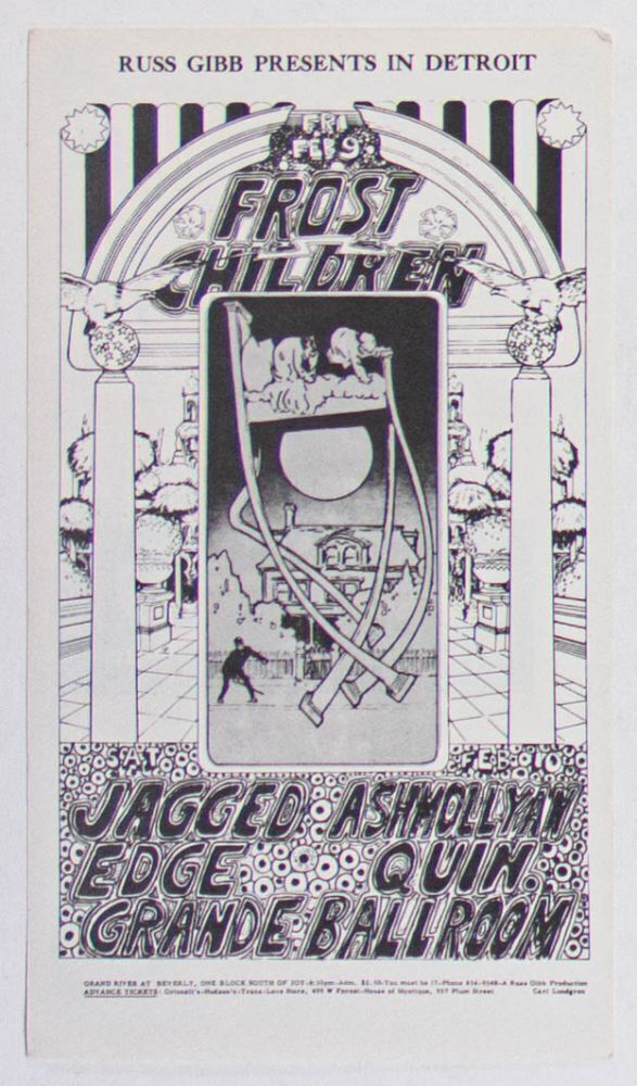 This postcard announced a pair of shows at The Grande Ballroom in February 1968 featuring Frost, Jagged Edge, Ashmollyan Quintet, and Children. The Grande Ballroom series produced some of the finest imagery from the 1960s music scene. In many cases, promoter Russ Gibb chose to only produce postcards to promote events. That being the case, Grande cards and card sets have become one of the most highly sought-after items by serious collectors.