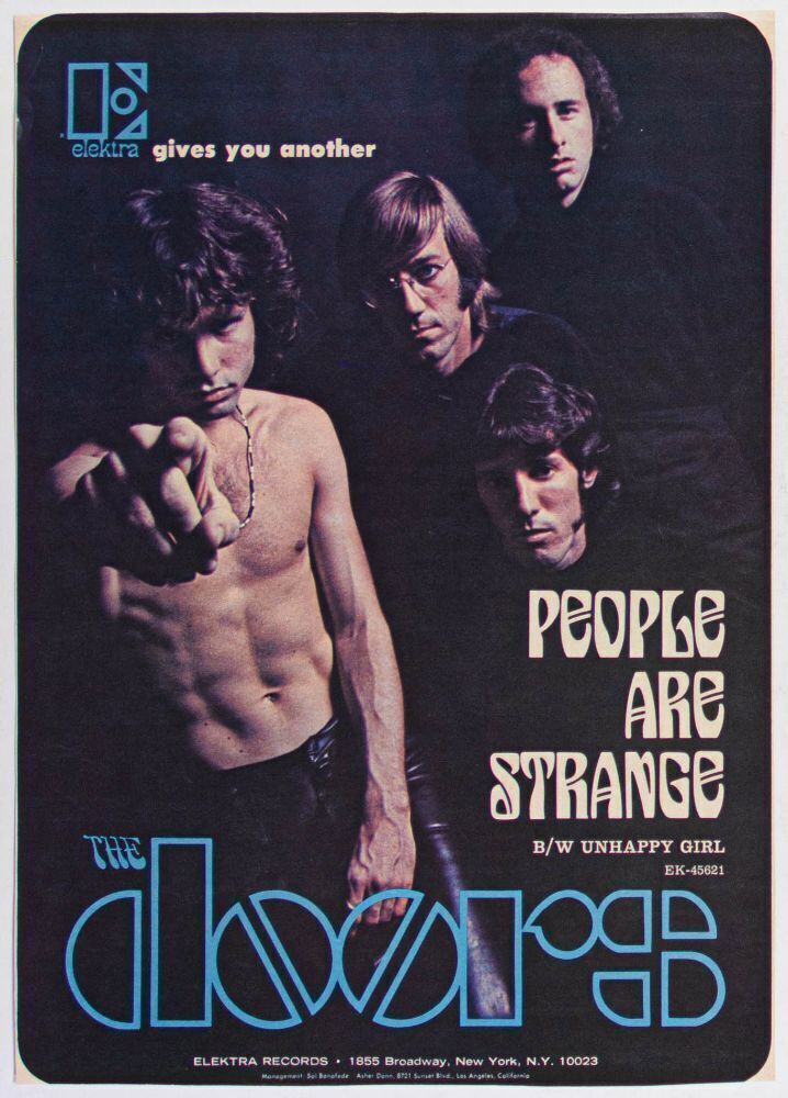 This full-page ad from Elektra Records was produced to promote The Doors' 1967 single, "People Are Strange". The now classic tune appeared on the band's second studio album, Strange Days, and peaked at #12 on the Billboard Hot 100 chart.