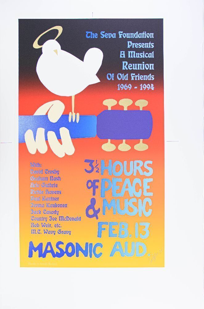 The Musical Reunion of Old Friends was a 1994 benefit concert for the SEVA foundation and hosted a number of legendary talent like Crosby & Nash, Arlo Guthrie, Richie Havens, Hot Tuna, and many more. The design was by Alton Kelley as a playful homage to the 1969 Woodstock poster.