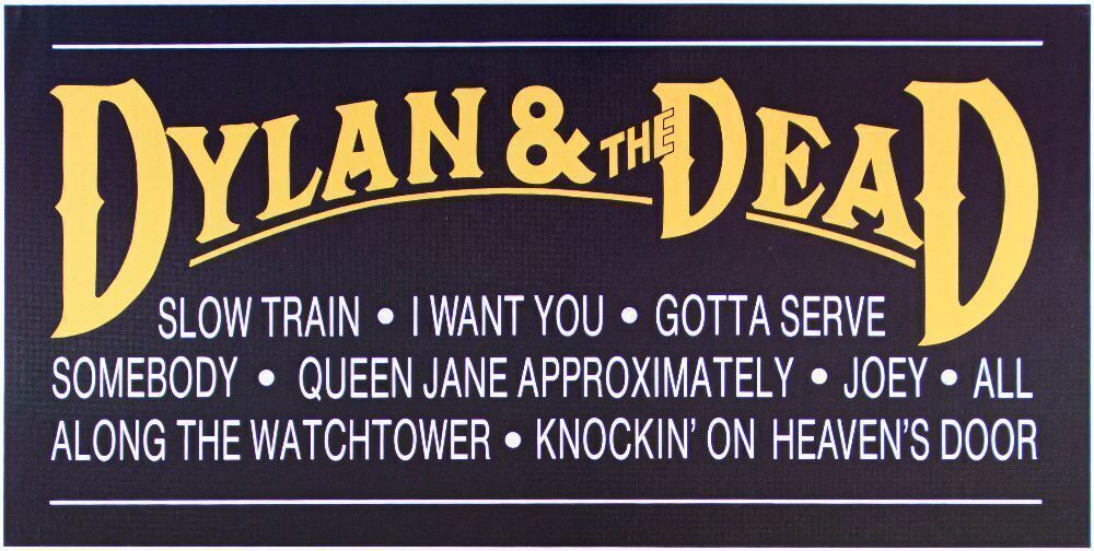 In 1987, Bob Dylan & The Grateful Dead embarked on a huge stadium tour of the same name that featured the two artists performing sets separately and together. This is a 1989 promotional poster for the release of the album Dylan & The Dead, which featured live tracks from those unique shows. Each track is listed on the poster!
