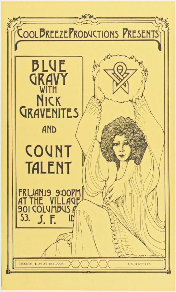 This poster was produced for Blue Gravy with Nick Gravenites and Count Talent (with Mike Bloomfield) appearing at The Village in San Francisco during January 1973.