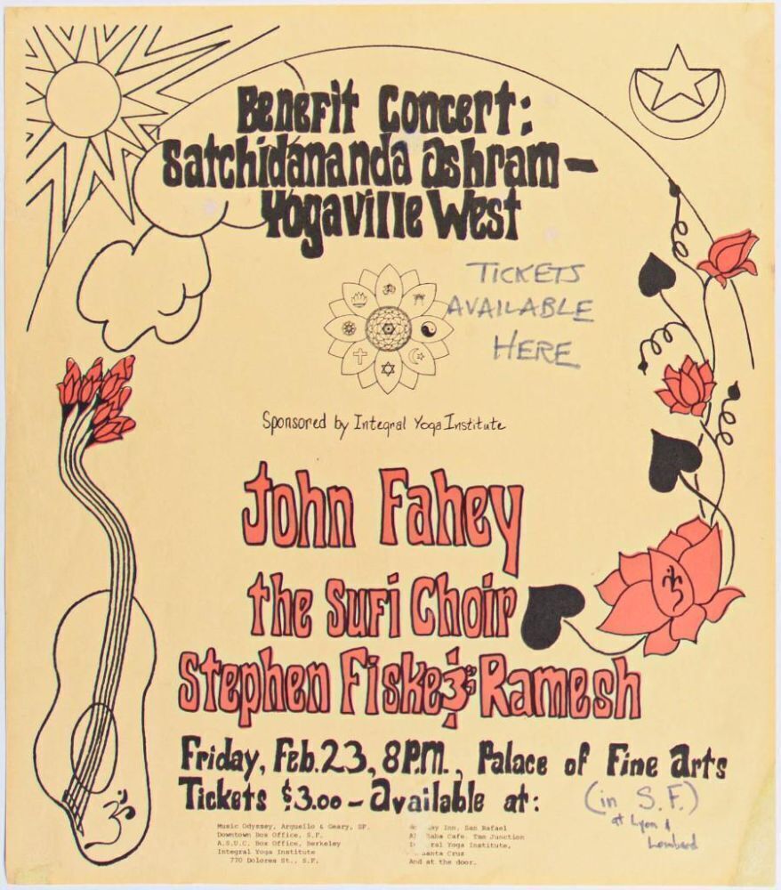 Poster for John Fahey, The Sufi Choir, Stephen Fiske & Ramesh appearing at the Palace of Fine Arts in San Francisco during 1968.