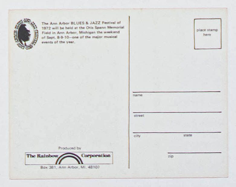 This postcard was created for the 1972 Ann Arbor Blues & Jazz Festival. The festival was held on Friday, Saturday & Sunday, September 8, 9 & 10, 1972 at Otis Spann Memorial Field. High-profile artists appeared, including Howlin' Wolf, Sun Ra & his Arkestra, Otis Rush, Miles Davis, and many more!