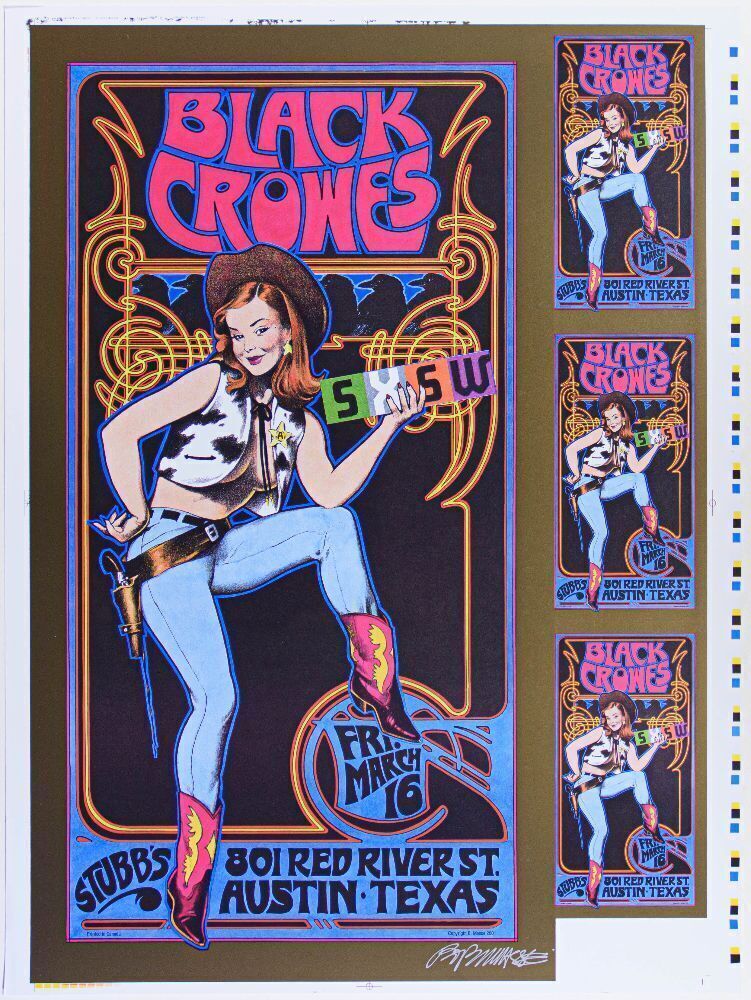Canadian artist Bob Masse is one of rock's most seasoned and prolific poster artists. He is perhaps best known in the collecting world for his design of the July 1967 Grateful Dead concert at Vancouver’s Agradome. This poster promoted the Black Crowe's appearance at Stubb's in Austin, Texas on March 16th, 2001 during South by Southwest.